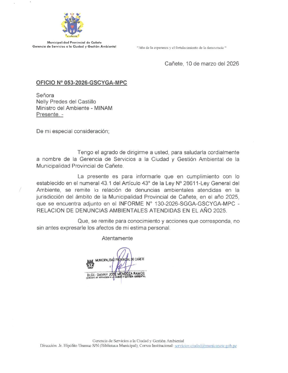 Informe sobre reporte de denuncias ambiental es anuales 2025 Municipalidad Provincial de Cañete