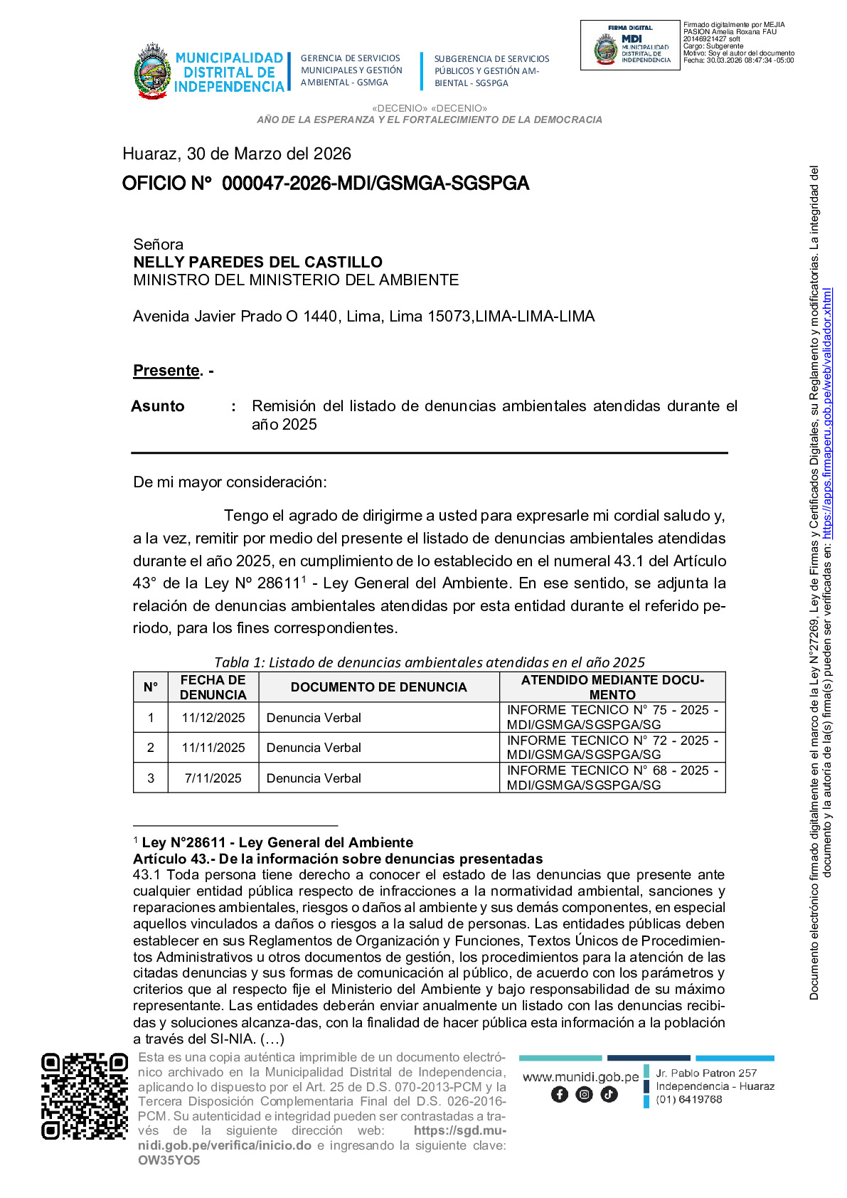 Informe sobre reporte de denuncias ambiental es anuales 2025 Municipalidad Distrital de Independencia