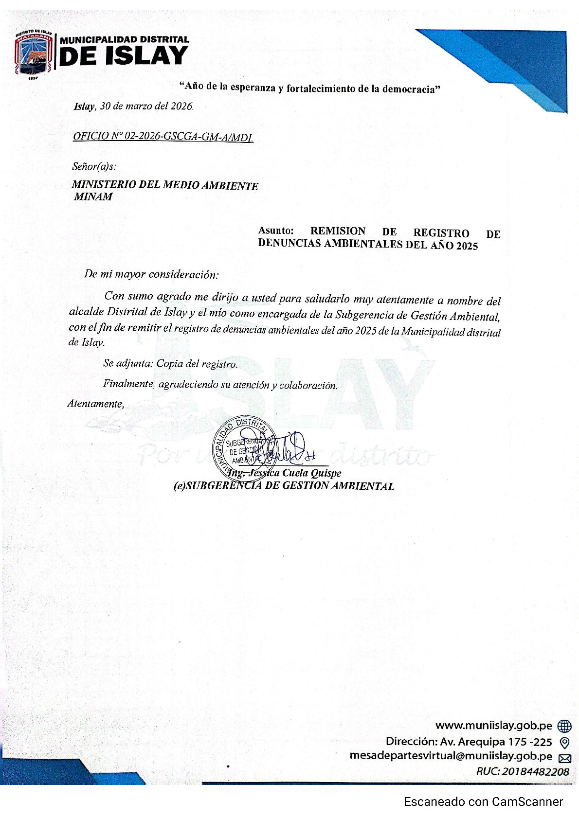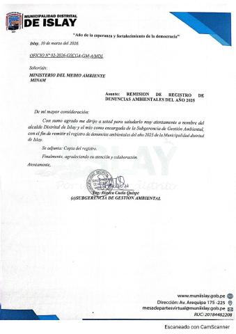 Informe sobre reporte de denuncias ambiental es anuales 2025 Municipalidad Distrital de Islay
