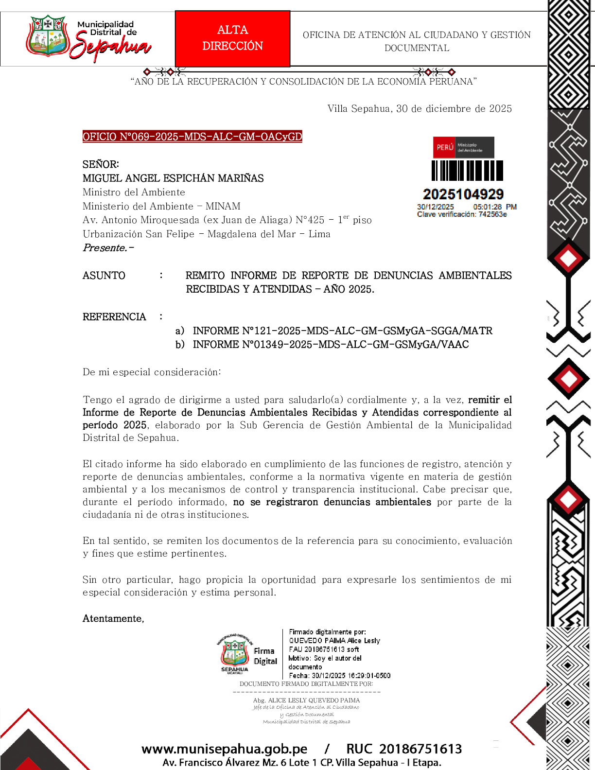 Informe sobre reporte de denuncias ambiental es anuales 2025 Municipalidad Distrital de Sepahua