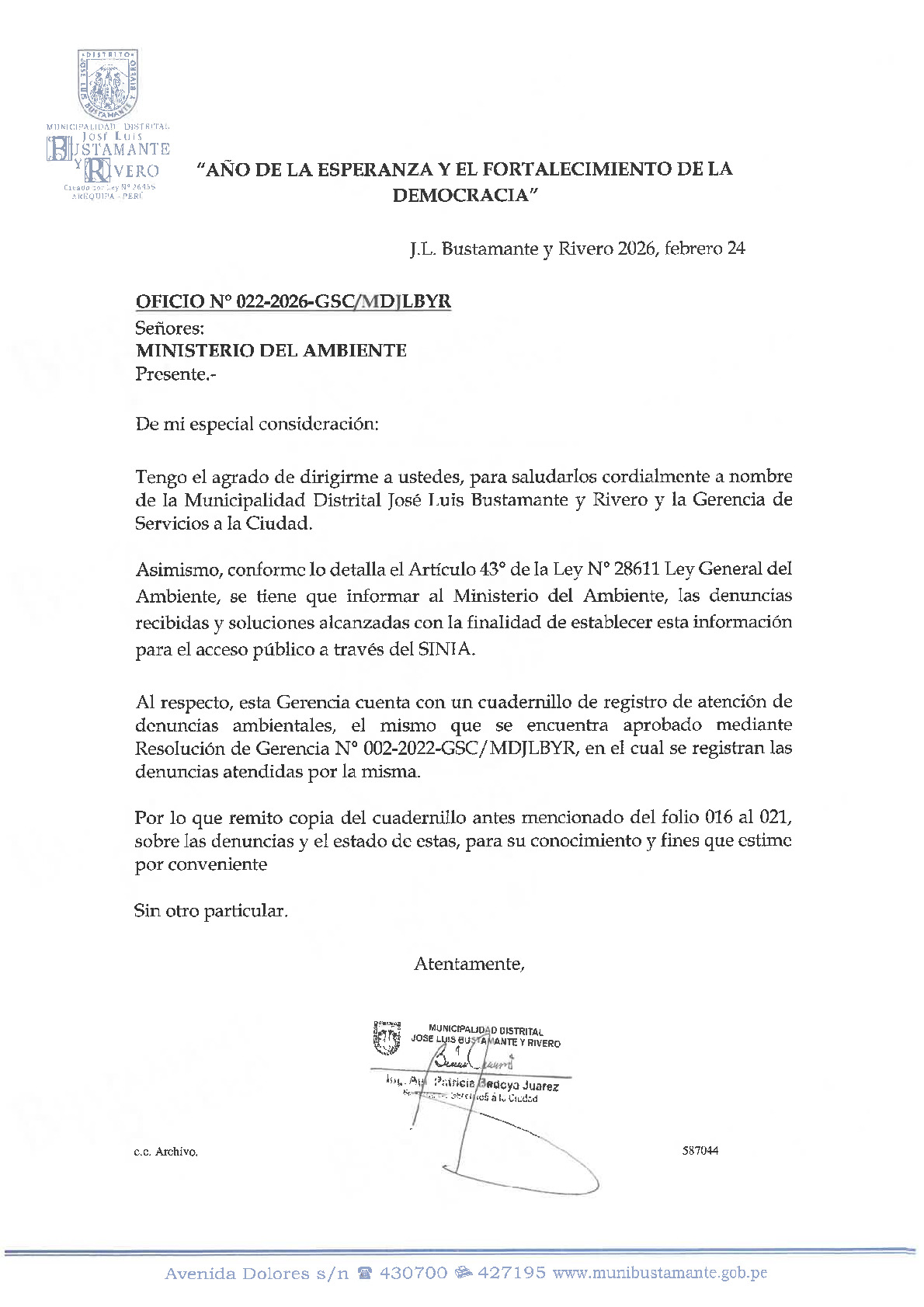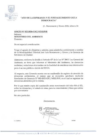 En cumplimiento de lo establecido en el Decreto Legislativo N° 1055 que modifica el artículo 43° de la Ley N° 28611, que indica que "Las entidades deberán enviar anualmente un listado con las denuncias recibidas y soluciones alcanzadas, con la finalidad de hacer pública esta información a la población a través del SINIA".