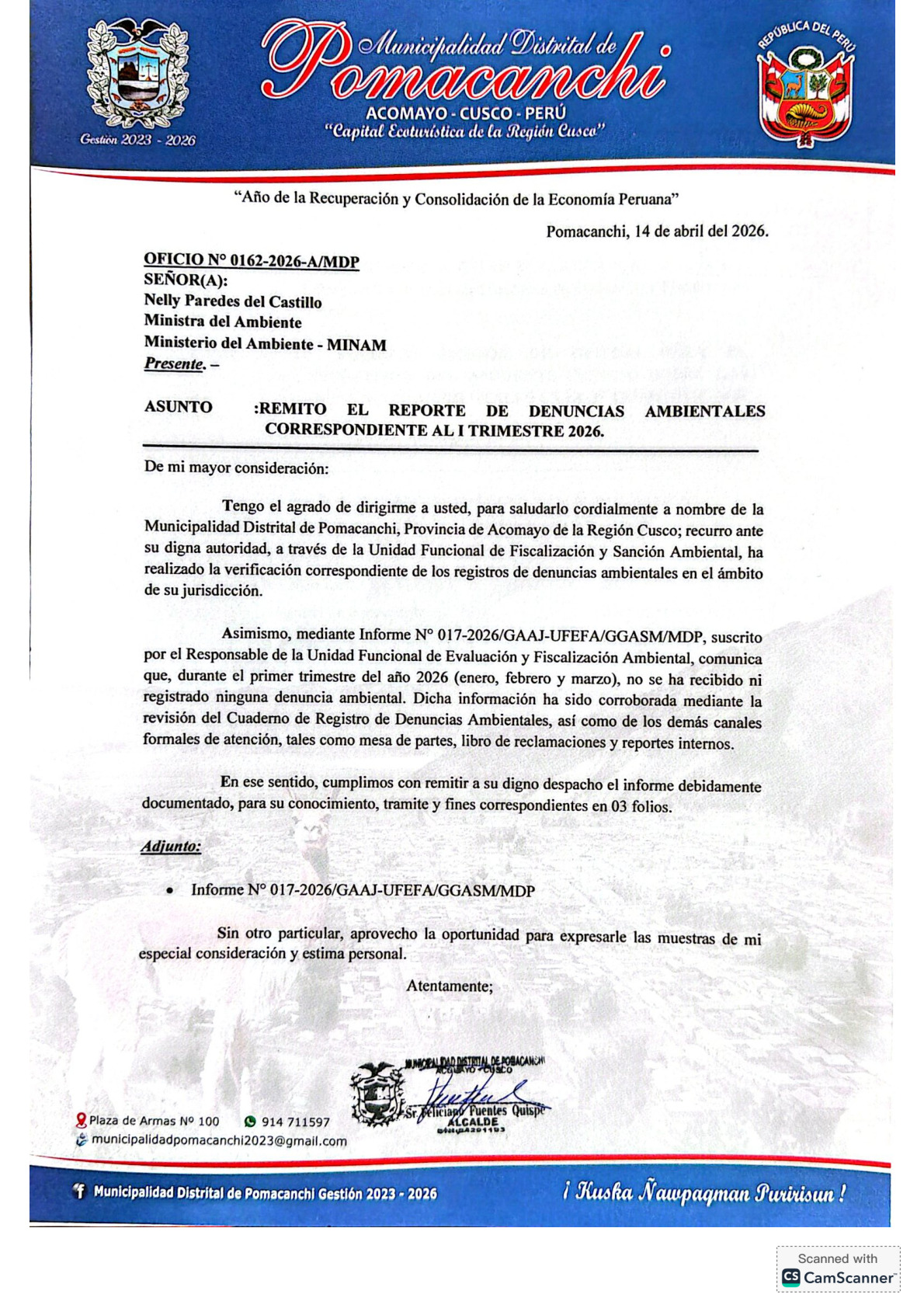 Informe sobre reporte de denuncias ambiental es anuales 2026 Municipalidad Distrital de Pomacanchi