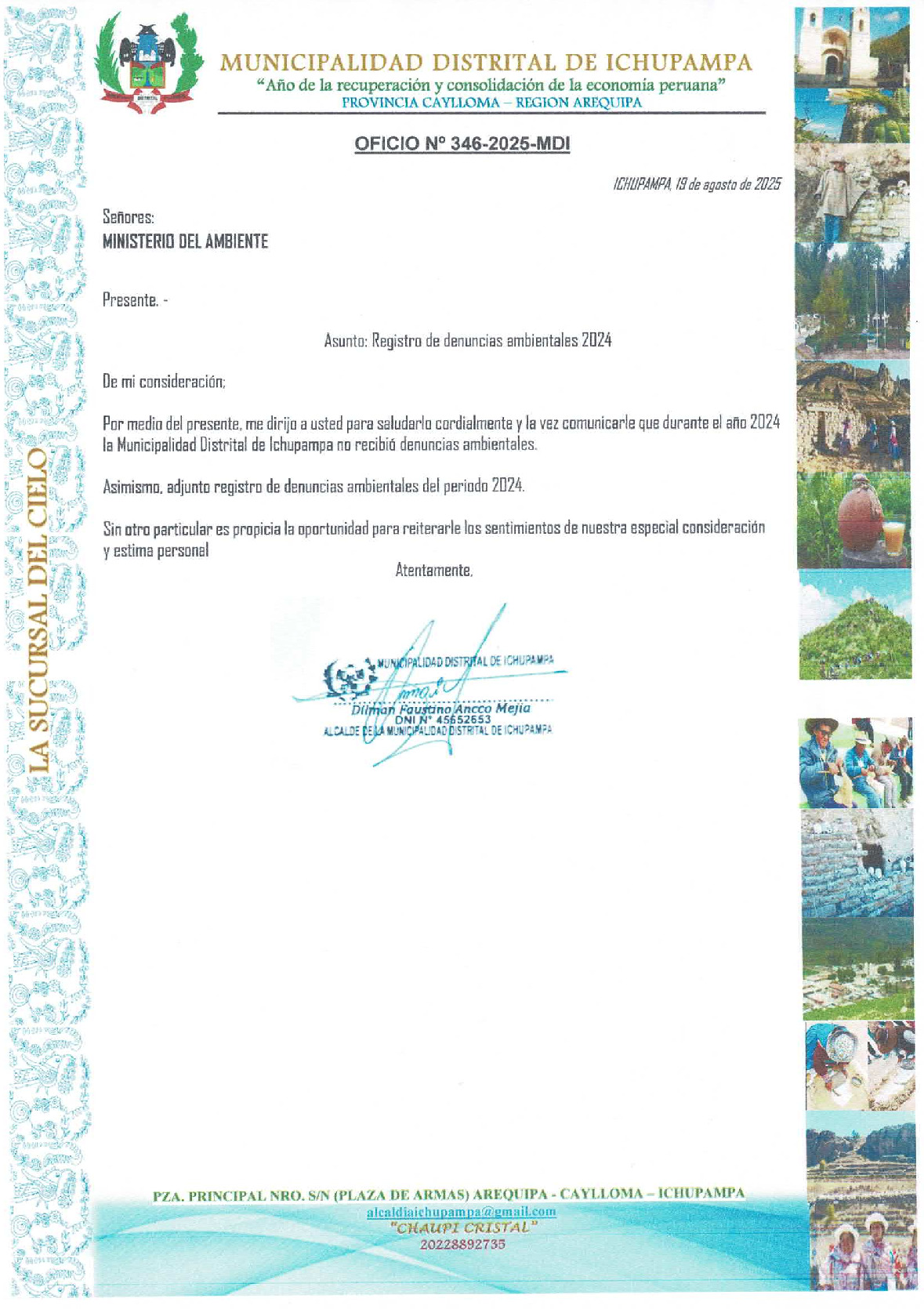 Informe sobre reporte de denuncias ambientales anuales 2024 Municipalidad Distrital de Ichupampa