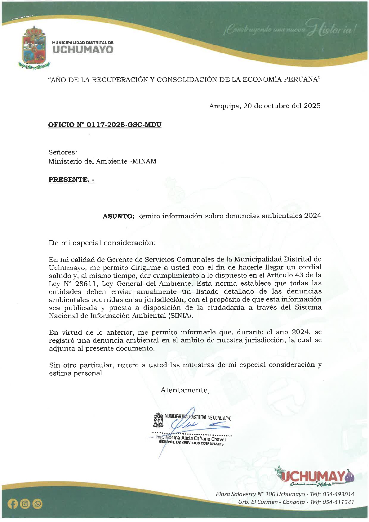 Informe sobre reporte de denuncias ambientales anuales 2024 Municipalidad Distrital de Uchumayo