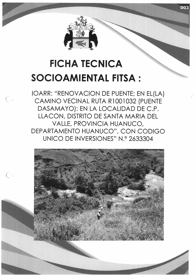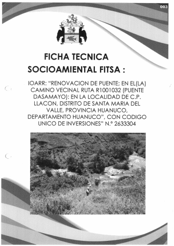 Elaborar la Ficha Técnica Socio Ambiental (FITSA) que permita Identificar y caracterizar los impactos ambientales y socio económicos que pudieran derivarse de la implementación del IOARR: "RENOVACION DE PUENTE; EN EL(LA) CAMINO VECINAL RUTA R1001032 (PUENTE DASAMAYO): EN LA LOCALIDAD DE C.P. LLACON, DISTRITO DE SANTA MARIA DEL VALLE, PROVINCIA HUANUCO, DEPARTAMENTO HUANUCO", con Código Único de Inversiones N° 2633304, considerando las medidas para prevenir, mitigar, corregir o compensar los impactos negativos.