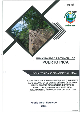 Elaborar la Ficha Técnica Socio Ambiental (FITSA) que permita Identificar y caracterizar los impactos ambientales y socio económicos que pudieran derivarse de la implementación del IOARR: RENOVACION DE PUENTE; EN EL(LA) PUENTE ALTO GALICIA, EN EL CAMINO VECINAL DE LA RUTA HU-978, CASERIO ALTO GALICIA, DISTRITO DE PUERTO INCA, PROVINCIA PUERTO INCA, DEPARTAMENTO HUANUCO los medios: físico, biológico y socio económico, especificando medidas para prevenir, mitigar, corregir o compensar los impactos negativos.
