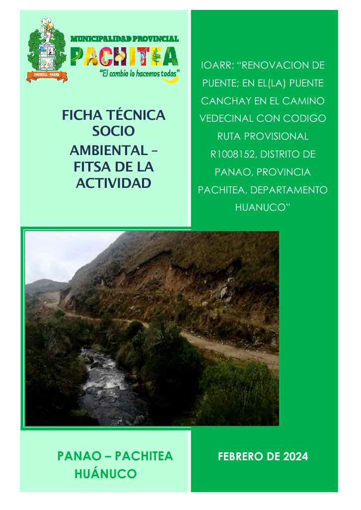 Elaborar la Ficha Técnica Socio Ambiental (FITSA) que permita Identificar y caracterizar los impactos ambientales y socio económicos que pudieran derivarse de la implementación del IOARR: "RENOVACION DE PUENTE; EN EL(LA) PUENTE CANCHAY EN EL CAMINO VECINAL CON CODIGO DE RUTA PROVISIONAL R1008152, DISTRITO DE PANAO, PROVINCIA PACHITEA, DEPARTAMENTO HUANUCO", con Código Único de Inversiones N° 2579021, considerando las medidas para prevenir, mitigar, corregir o compensar los impactos negativos.