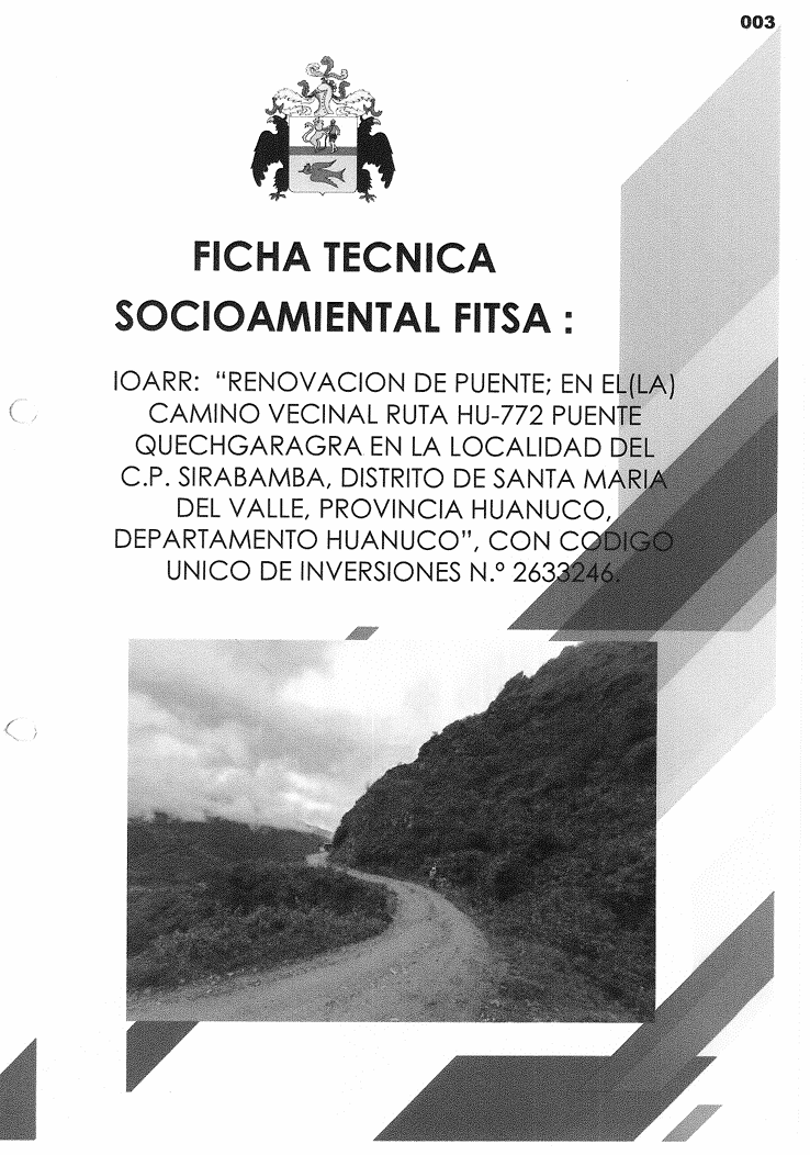 Elaborar la Ficha Técnica Socio Ambiental (FITSA) que permita Identificar y caracterizar los impactos ambientales y socio económicos que pudieran derivarse de la implementación del IOARR: "RENOVACION DE PUENTE; EN EL(LA) CAMINO VECINAL RUTA HU-772 PUENTE QUECHGARAGRA EN LA LOCALIDAD DEL C.P. SIRABAMBA, DISTRITO DE SANTA MARIA DEL VALLE, PROVINCIA HUANUCO, DEPARTAMENTO HUANUCO", con Código Único de Inversiones N.° 2633246, considerando las medidas para prevenir, mitigar, corregir o compensar los impactos negativos.