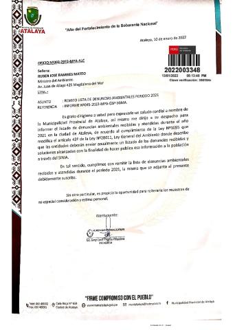 Lista de denuncias ambientales de la Municipalidad Provincial de Atalaya del 2021