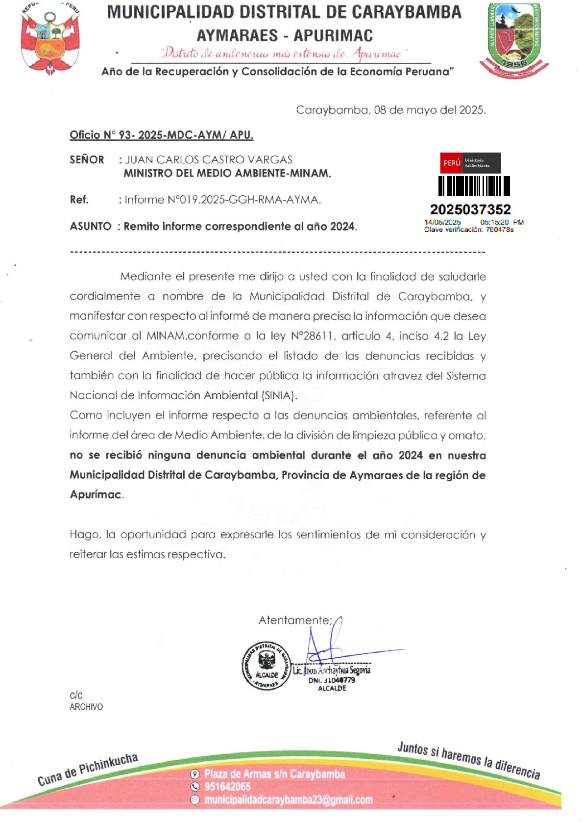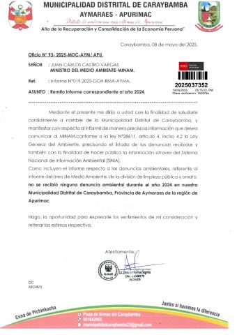 Listado de denuncias ambientales 2024 de la Municipalidad Distrital de Caraybamba