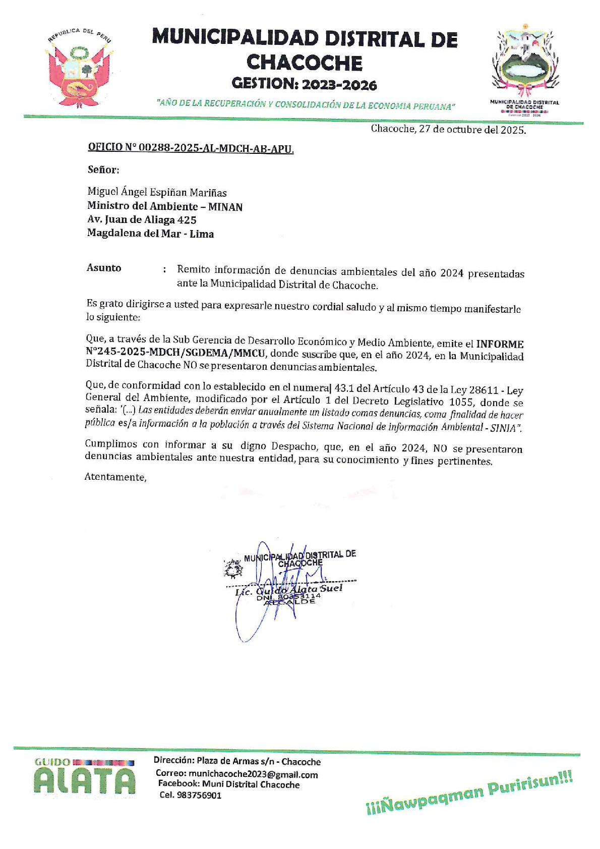 Listado de denuncias ambientales 2024 de la Municipalidad Distrital de Chacoche