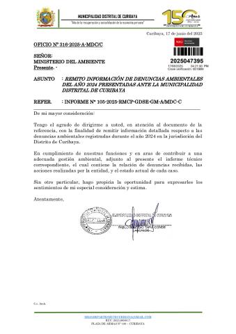 Listado de denuncias ambientales 2024 de la Municipalidad Distrital de Curibaya