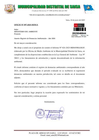 Listado de denuncias ambientales 2024 de la Municipalidad Distrital de Saisa