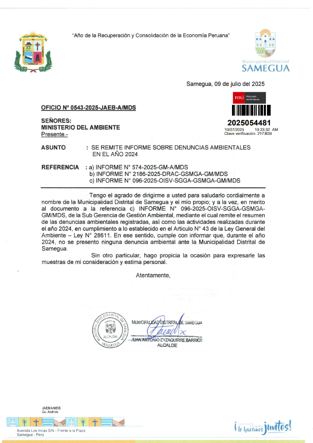Listado de denuncias ambientales 2024 de la Municipalidad Distrital de Samegua