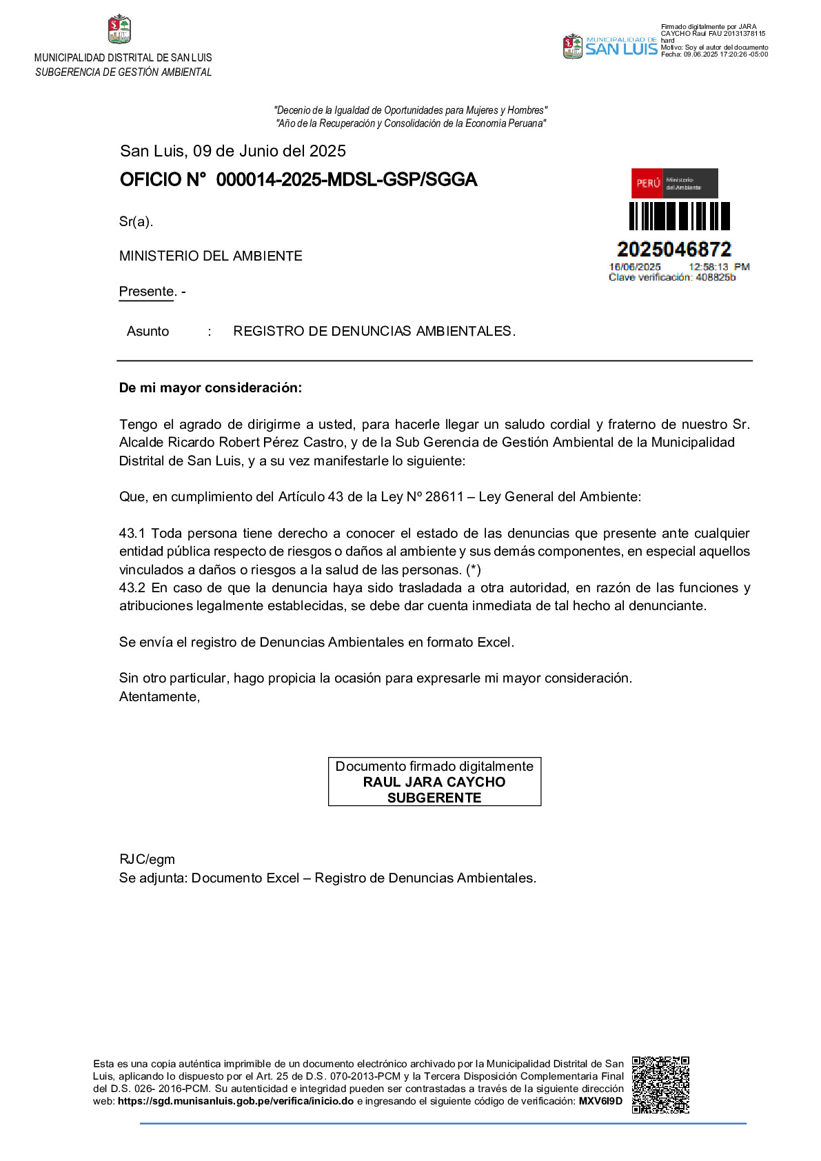 Listado de denuncias ambientales 2024 de la Municipalidad Distrital de San Luis