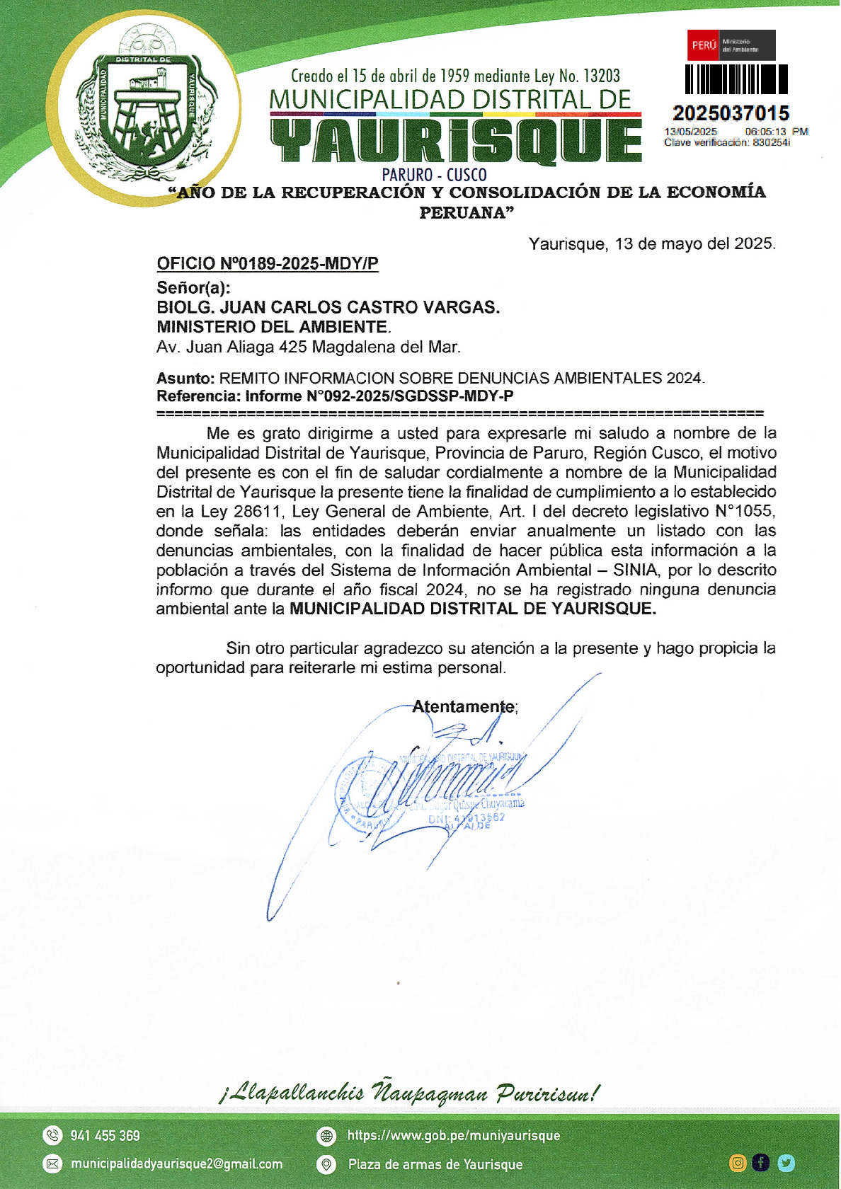 Listado de denuncias ambientales 2024 de la Municipalidad Distrital de Yaurisque