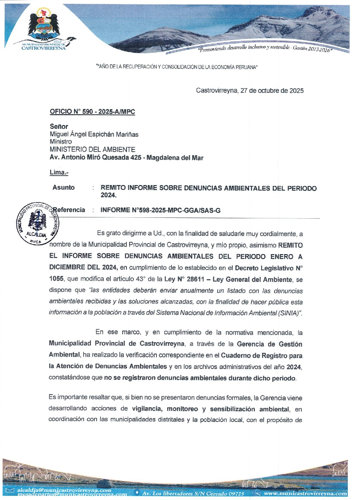 Listado de denuncias ambientales 2024 de la Municipalidad Provincial Castro Virreyna