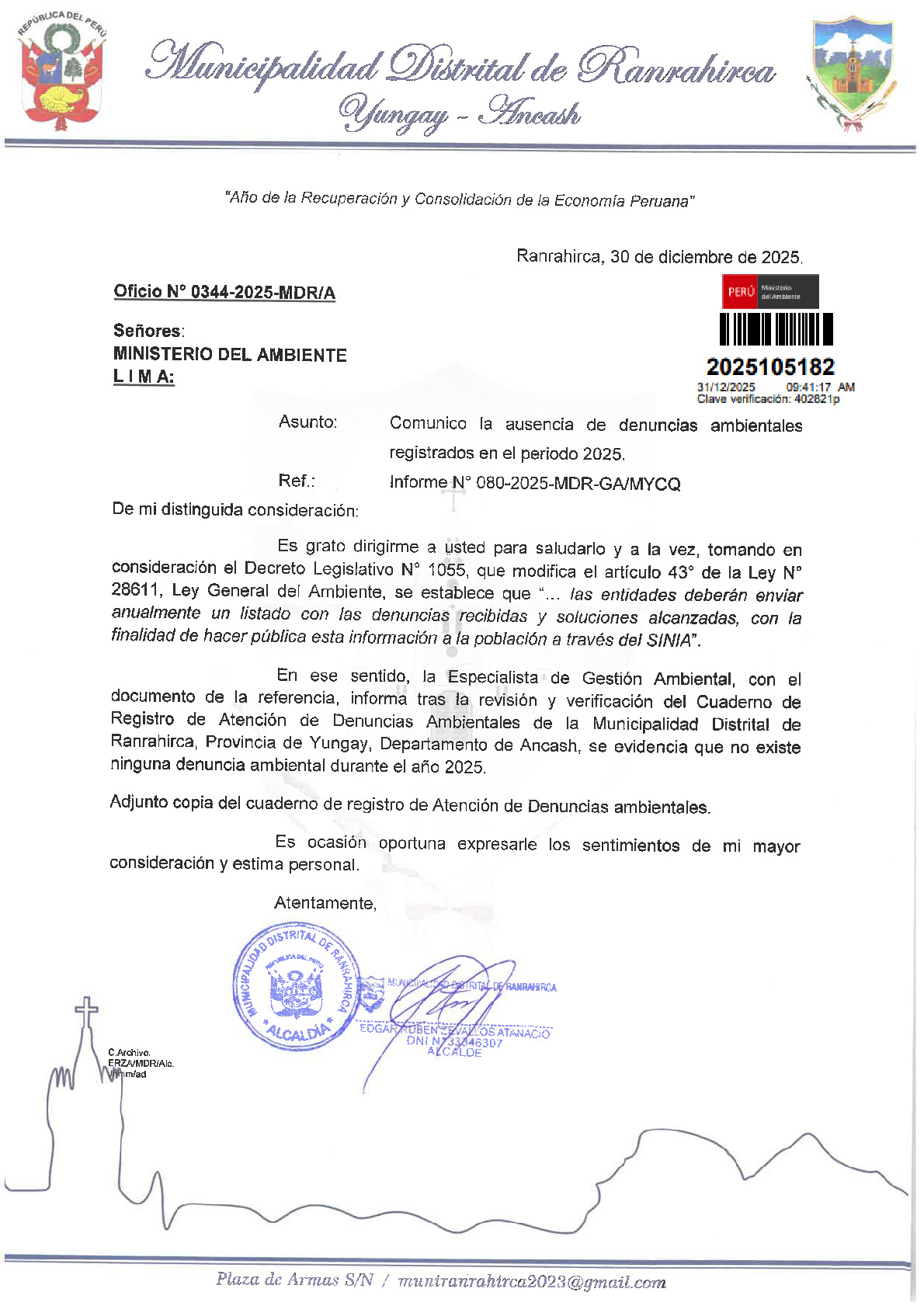 Listado de denuncias ambientales 2025 de la Municipalidad Distrital de Ranrahirca