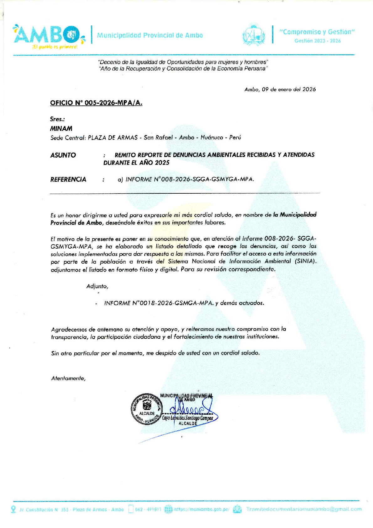 Listado de denuncias ambientales 2025 de la Municipalidad Distrital de Ambo