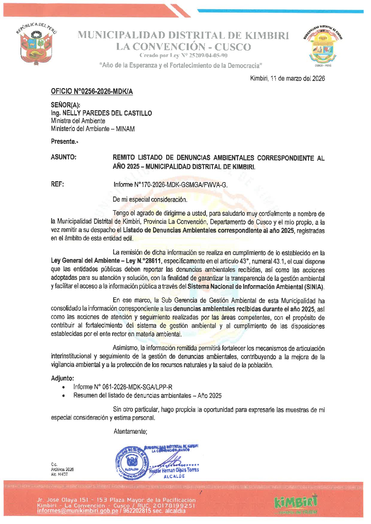 Listado de denuncias ambientales 2025 de la Municipalidad Distrital de Kimbiri