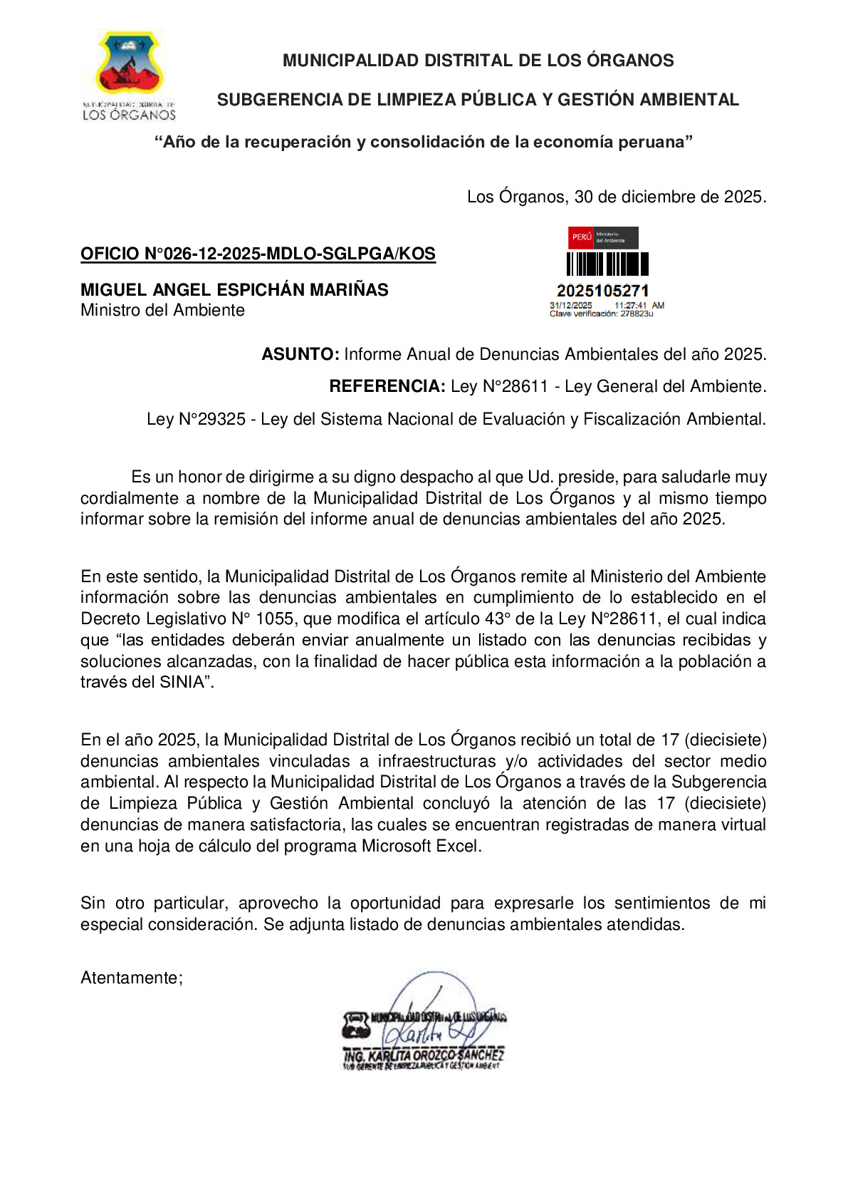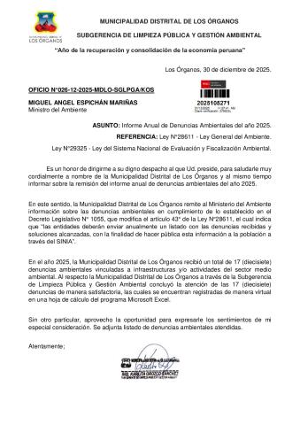 Listado de denuncias ambientales 2025 de la Municipalidad Distrital de los Organos
