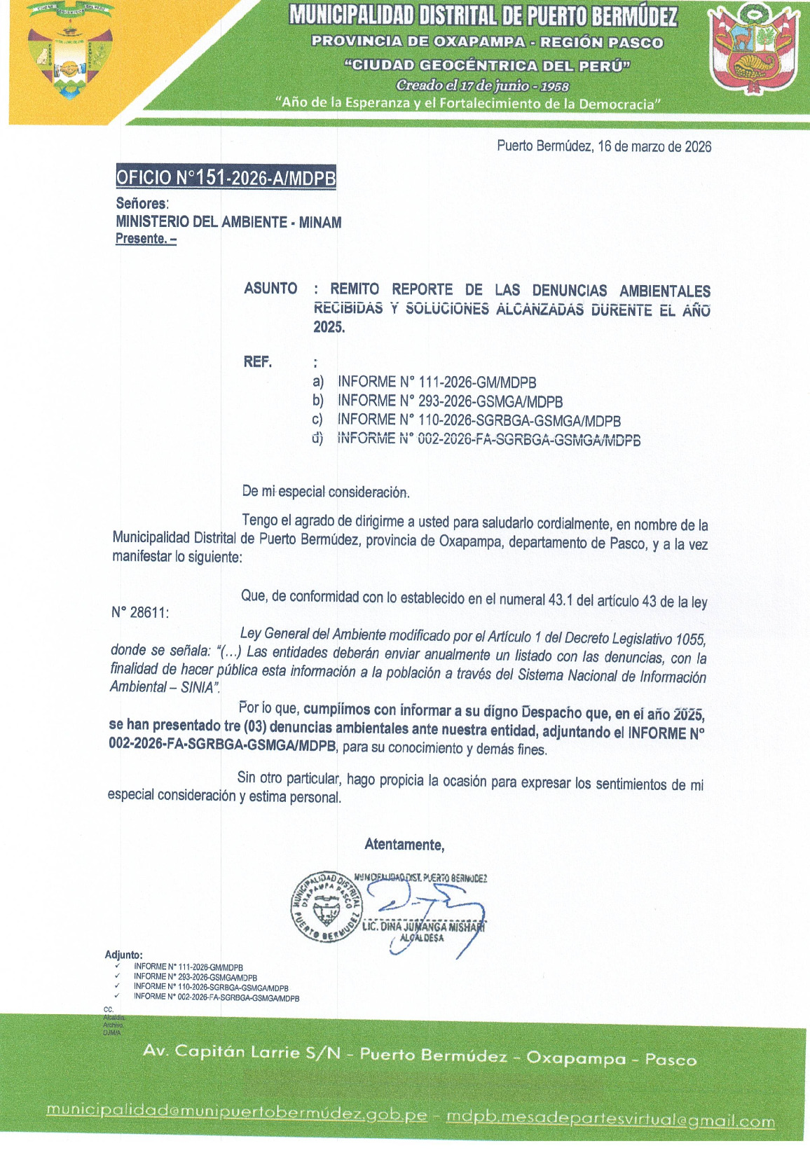 Listado de denuncias ambientales 2025 de la Municipalidad Distrital de Puerto Bermudez