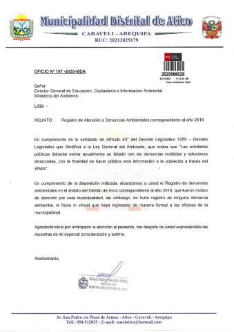 La Municipalidad Distrital de Atico remite al Ministerio del Ambiente información sobre las denuncias ambientales registradas por esta entidad correspondiente al año 2019, en cumplimiento de lo establecido en el Decreto Legislativo N° 1055 que modifica el artículo 43° de la Ley N° 28611, que indica que "Las entidades deberán enviar anualmente un listado con las denuncias recibidas y soluciones alcanzadas, con la finalidad de hacer pública esta información a la población a través del SINIA".