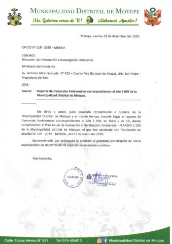 La Municipalidad Distrital de Motupe remite al Ministerio del Ambiente información sobre las denuncias y quejas ambientales registradas por esta entidad correspondiente al año 2020, en cumplimiento de lo establecido en el Decreto Legislativo N° 1055 que modifica el artículo 43° de la Ley N° 28611, que indica que "Las entidades deberán enviar anualmente un listado con las denuncias recibidas y soluciones alcanzadas, con la finalidad de hacer pública esta información a la población a través del SINIA".