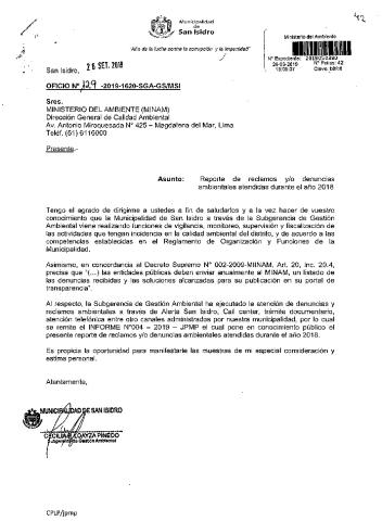 La Municipalidad Distrital de San Isidro remite al Ministerio del Ambiente información sobre las denuncias ambientales registradas por esta entidad correspondiente al año 2018, en cumplimiento de lo establecido en el Decreto Legislativo N° 1055 que modifica el artículo 43° de la Ley N° 28611, que indica que "Las entidades deberán enviar anualmente un listado con las denuncias recibidas y soluciones alcanzadas, con la finalidad de hacer pública esta información a la población a través del SINIA."