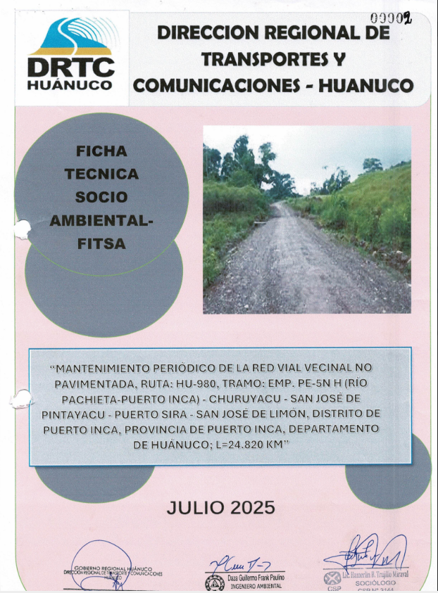 Mantenimiento periódico del camino vecinal no pavimentada, ruta: hu-980, tramo: emp. pe-5n h (río Pachieta-Puerto Inca) - Churuyacu - San José de Pintayacu - Puerto Sira - San José de Limón, distrito de Puerto Inca, provincia de Puerto Inca