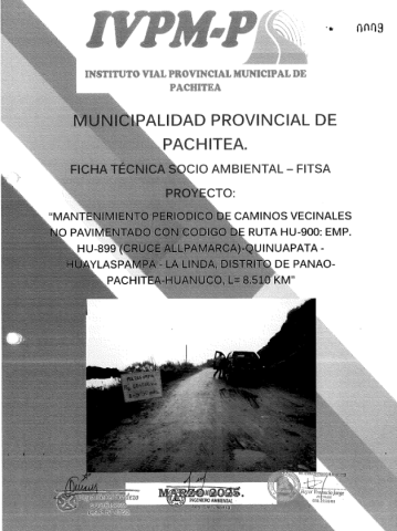 Mantenimiento periódico del camino vecinal no pavimentado con código de ruta hu-900: emp. hu-899 (Cruce Allpamarca)-Quinuapata-Huaylaspampa-la linda, distrito de Panao- Pachitea-Huánuco, L= 8.510 km.
