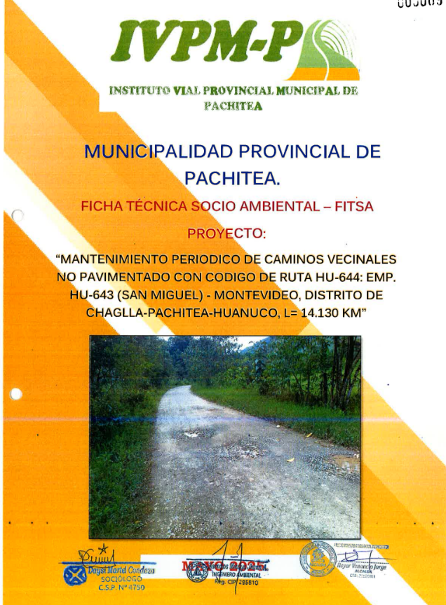 Mantenimiento periódico del camino vecinal no pavimentado con código de ruta hu-644: emp.hu-643 (San Miguel) – Montevideo, distrito de Chaglla, Pachitea – Huánuco