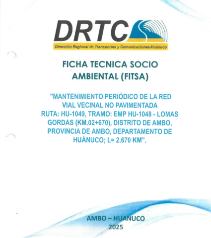 Mantenimiento periódico de camino vecinal no pavimentado ruta: hu-1049, tramo: emp hu-1048 - Lomas Gordas (km.02+670), distrito de Ambo, provincia de Ambo, departamento de Huánuco; l= 2.670 km.
