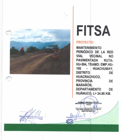 Mantenimiento periódico de camino vecinal no pavimentado ruta: hu-504, tramo: emp.hu-100 - Huachumay, distrito de Huacrachuco, provincia de Marañón, departamento de Huánuco; l= 24.86 km