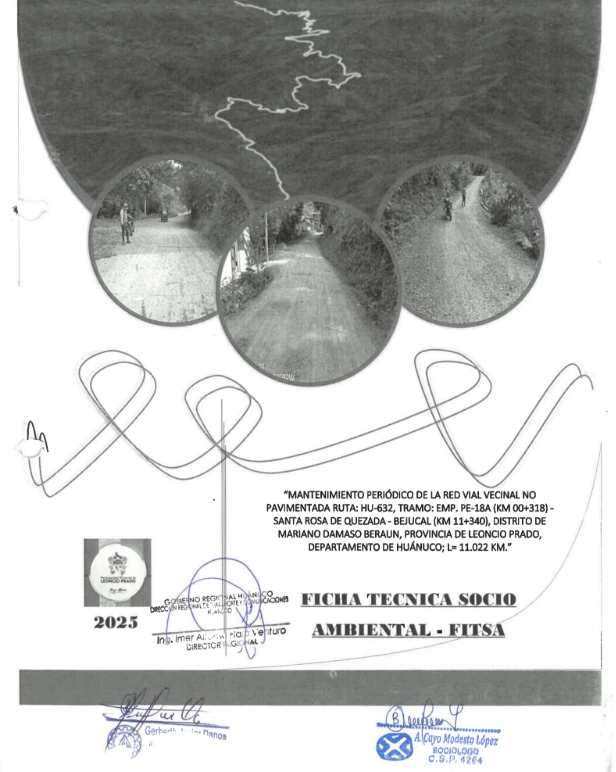 Mantenimiento periódico de camino vecinal no pavimentado ruta: hu-632, tramo: emp. pe-18a (km 00+318) - Santa Rosa de Quezada - Bejucal (km 11+340), distrito de Mariano Damaso Beraun, provincia de Leoncio Prado, departamento de Huánuco; l= 11.022 km