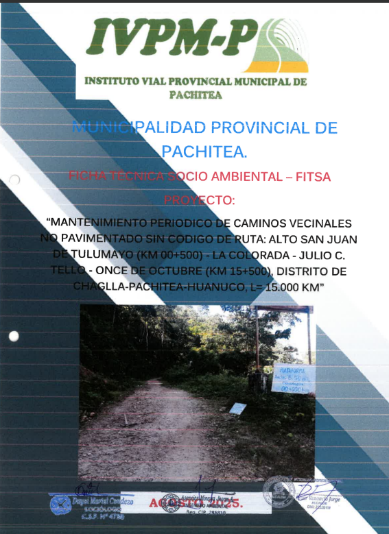 Mantenimiento periódico del camino vecinal no pavimentado sin código de ruta, alto San Juan de Tulumayo (km00+500) - La Colorada - Julio C Tello-Once de Octubre (km 15+500);l=1.020 km, distrito de Chaglla, provincia de Pachitea, región Huánuco