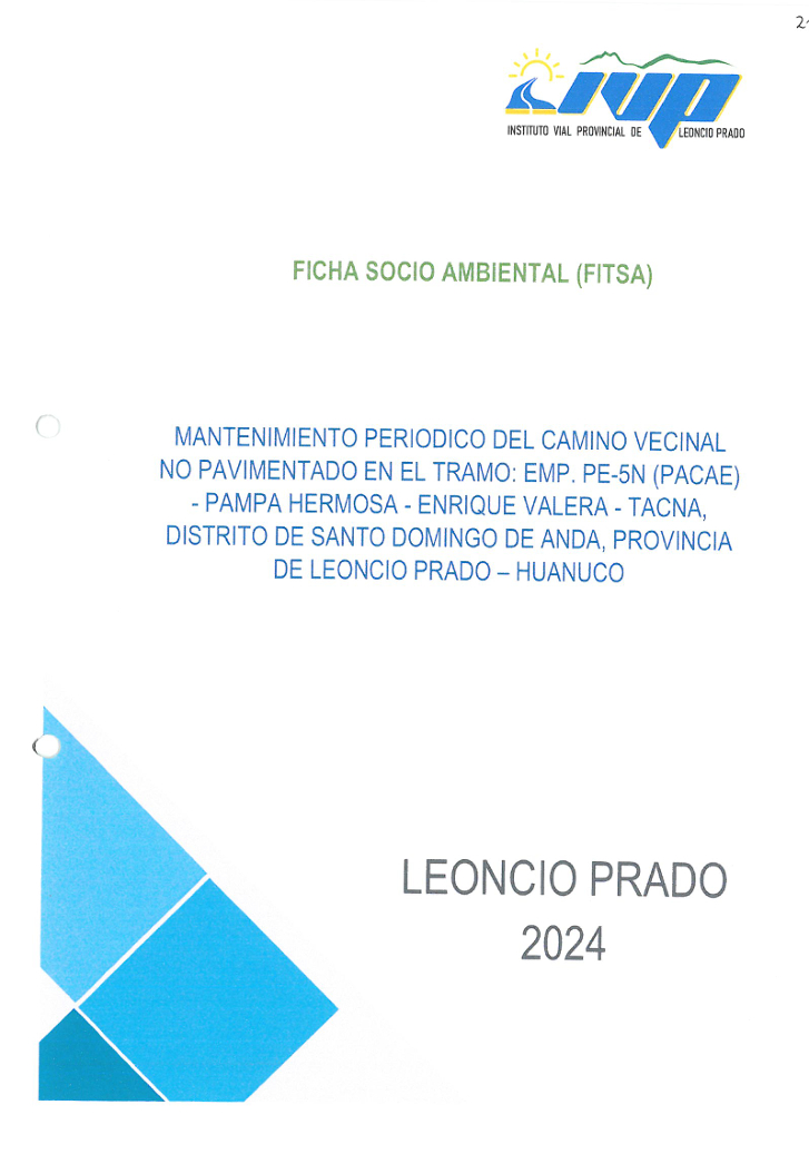 "Mantenimiento periódico del camino vecinal no pavimentado en el tramo: emp. pe-5n (Pacae) - Pampa Hermosa - Enrique Valera - Tacna, distrito de Santo Domingo de Anda, provincia de Leoncio Prado-Huánuco”