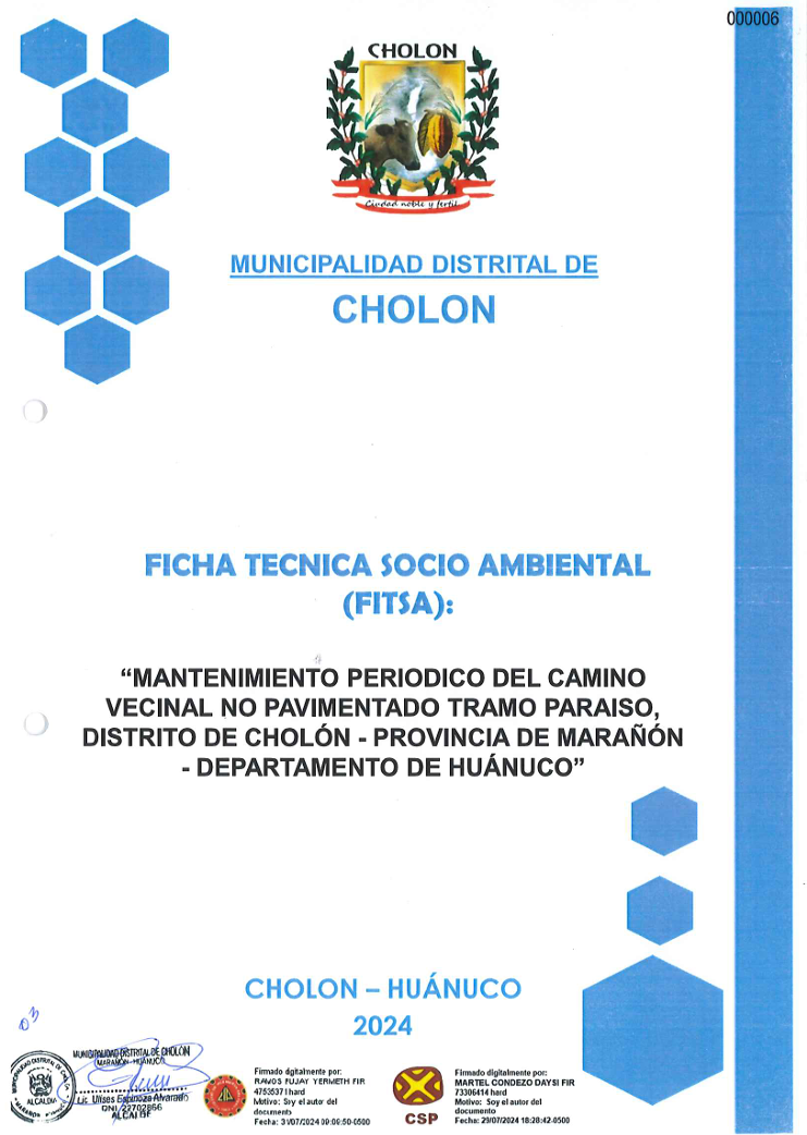 La Ficha Técnica Socio Ambiental (FITSA) tiene por objetivo caracterizar los impactos ambientales y socio económicos del proyecto "MANTENIMIENTO PERIODICO DEL CAMINO VECINAL NO PAVIMENTADO TRAMO PARAISO, DISTRITO DE CHOLÓN - PROVINCIA DE MARAÑÓN - DEPARTAMENTO DE HUÁNUCO", para la ejecución y operación de la vía; considerando condiciones óptimas de localización y diseño, de esa manera sea factible, desde el punto de vista ambiental.