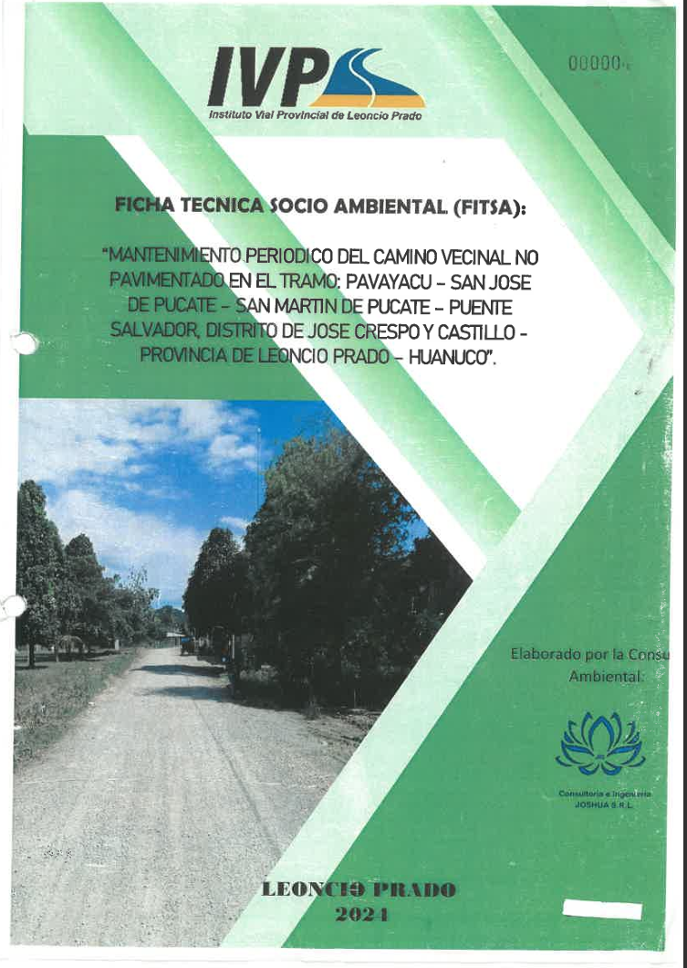 Desarrollar la Ficha Técnica Socio Ambiental (FITSA) que permita caracterizar del medio físico, biológico y socioeconómico e interactuar con las actividades y así definir y describir los impactos ambientales y socio económico que pudiera originarse durante la ejecución de la actividad MANTENIMIENTO PERIODICO DEL CAMINO VECINAL NO PAVIMENTADO EN EL TRAMO: PAVAYACU-SAN JOSE DE PUCATE - HUANUCO DE PUCATE - CAMINO VECINAL SALVADOR, DISTRITO DE JOSE CRESPO Y CASTILLO- PROVINCIA DE LEONCIO PRADO - HUANUCO, considerando condiciones óptimas de localización y diseño, de esa manera sea factible, desde el punto de vista ambiental.
