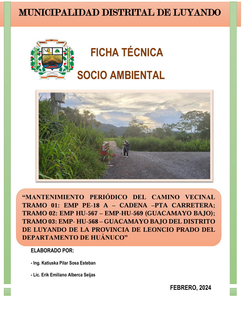 Mantenimiento periódico del camino vecinal tramo 01: emp pe-18 A - Cadena -pta carretera; tramo 02: emp hu-567-emp-hu-569 (Guacamayo Bajo); tramo 03: emp- hu-568-Guacamayo Bajo del distrito de Luyando de la provincia de Leoncio Prado