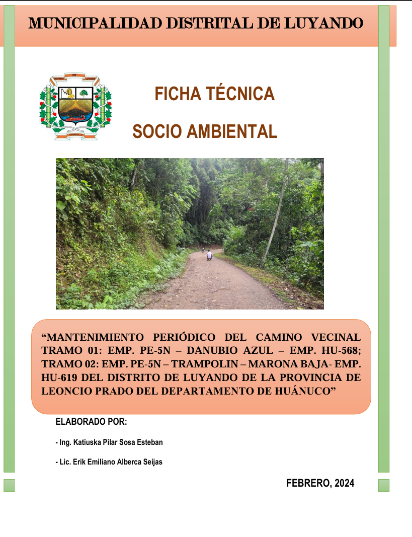 "Mantenimiento periódico del camino vecinal tramo 01: emp. pe-5n - Danubio Azul - emp. hu-568; tramo 02: emp. pe-5n-Trampolin - Marona Baja- emp. hu-619 del distrito de Luyando de la provincia de Leoncio Prado del departamento de Huánuco"