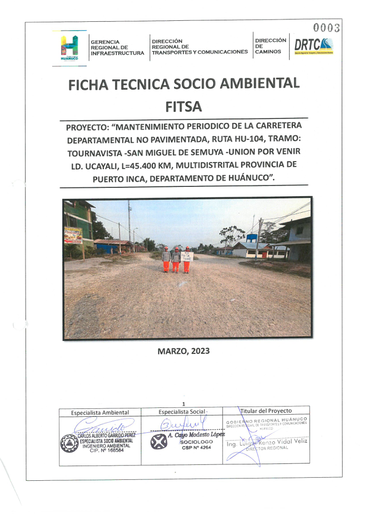 Elaboración de la Ficha Técnica Socio Ambiental (FITSA) del proyecto: "MANTENIMIENTO PERIODICO DE LA CARRETERA DEPARTAMENTAL NO PAVIMENTADA, RUTA HU-104, TRAMO: LD. UCAYALI-UNIÓN PORVENIR-SAN MIGUEL DE SEMUYA -TOURNAVISTA, MULTIDISTRITAL, PROVINCIA DE PUERTO INCA, DEPARTAMENTO DE HUÁNUCO, L=45.400 KM" y conformidad por parte de la Autoridad Competente.