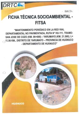 Elaborar la Ficha Técnica Socio Ambiental (FITSA) que permita Identificar y caracterizar los impactos ambientales y socio económicos que pudieran derivarse de la implementación del MANTENIMIENTO PERIÓDICO EN LA RED VIAL DEPARTAMENTAL NO PAVIMENTADA, RUTA N° HU-111, TRAMO: SAN JOSE DE COZO (KM. 06+000) YARUMAYO (KM. 21.560); L= 15.56 KM., DISTRITO DE YARUMAYO PROVINCIA DE HUÁNUCO DEPARTAMENTO DE HUÁNUCO, los medios: físico, biológico y socio económico, especificando medidas para prevenir, mitigar, corregir o compensar los impactos negativos