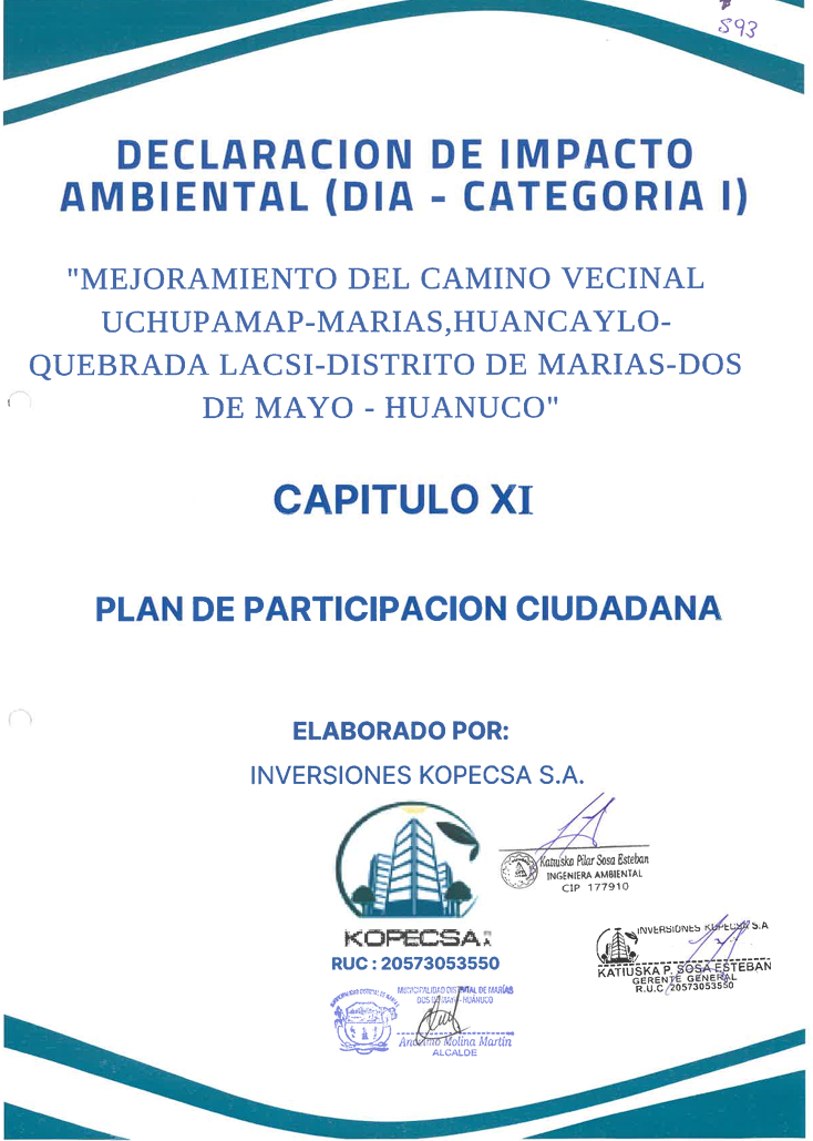 Como parte del presente instrumento ambiental se ha desarrollado un proceso de participación ciudadana que buscó gestionar la comunicación entre los actores involucrados que son representados por sus autoridades locales y algunos pobladores a fin de mejorar el proceso de adopción de decisiones y crear comprensión mutua dentro del área de influencia, así como identificar el nivel de conocimiento de proyecto y, de ser el caso, informar con detenimiento las características de este.