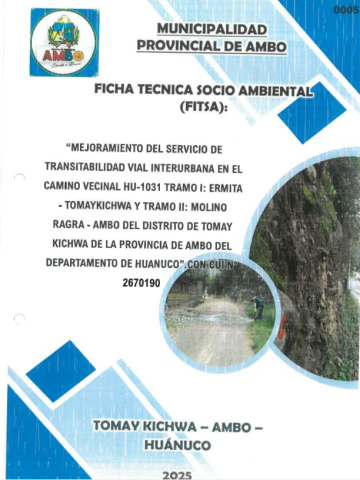 Mejoramiento del servicio de transitabilidad vial interurbana en el camino vecinal hu-1031 tramo I: Ermita Tomaykichwa y tramo II: Molino Ragra Ambo del distrito de Tomay Kichwa de la provincia de Ambo del departamento de Huánuco