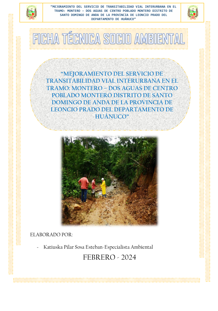 Elaboración de la Ficha Técnica Social Ambiental del servicio: "MEJORAMIENTO DEL SERVICIO DE TRANSITABILIDAD VIAL INTERURBANA EN EL TRAMO: MONTERO-DOS AGUAS DE CENTRO POBLADO MONTERO DISTRITO DE SANTO DOMINGO DE ANDA DE LA PROVINCIA DE LEONCIO PRADO DEL DEPARTAMENTO DE HUÁNUCO"