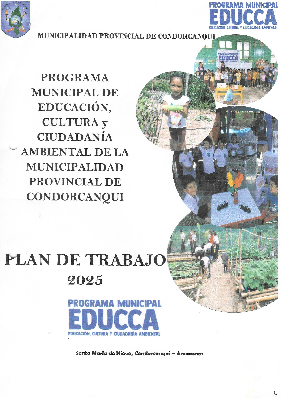 El Plan de Trabajo 2025 del Programa Municipal EDUCCA (Educación, Cultura y Ciudadanía Ambiental) de la Municipalidad Provincial de Condorcanqui es la herramienta de gestión clave para ejecutar las actividades orientadas a cumplir las metas de la Política Nacional del Ambiente al 2030, específicamente en el objetivo prioritario N°9. El plan fue aprobado mediante la Ordenanza Municipal N°003 - 2023/MPC y busca elevar el nivel de conciencia y cultura ambiental de la población, promoviendo cambios de actitud y la formación de valores para construir comunidades sostenibles desde la gestión local. Las acciones se articulan en respuesta a problemas ambientales identificados en la provincia, como la deficiente gestión de residuos sólidos, el ruido excesivo, la quema de desechos y la contaminación de cuerpos de agua.