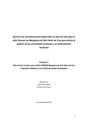 Los Manglares de San Pedro de Vice es un humedal costero, altamente productivo y de gran importancia para las comunidades locales. Fue designado como Sitio Ramsar el 12 de junio de 2008, siendo reconocido por su riqueza en aves. El plan de uso turístico para el sitio Ramsar Manglares de San Pedro de Vice se elabora con el propósito de promover una gestión sostenible del turismo en el sitio, tomando de base la zonificación existente e identificando las modalidades de uso, estrategias y acciones que permitan una adecuada gestión de los visitantes y el desarrollo de una oferta de actividades turísticas y recreativas que corresponda a los objetivos de conservación de este importante humedal costero del Perú. El proceso de elaboración del plan de uso turístico del sitio Ramsar San Pedro de Vice se realiza siguiendo la instancia de consulta y validación del Comité de Gestión Participativo, que han participado desde la etapa de levantamiento de información primaria y del proceso de validación del plan propuesto. Este es el primer ejercicio de planificación turística para un sitio Ramsar en el Perú.