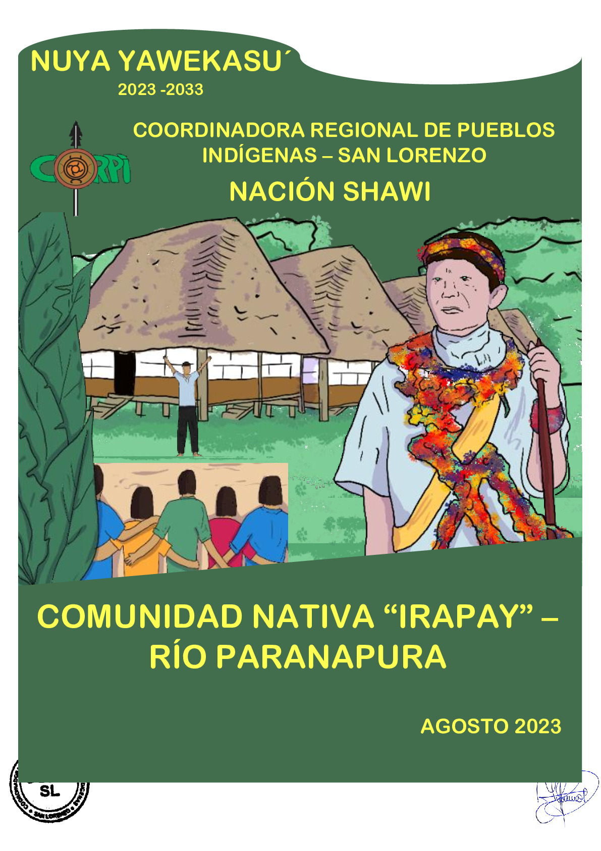 El Plan de Vida de la Comunidad Nativa Irapay es un instrumento de planificación participativa que orienta el desarrollo de la comunidad para el periodo 2023–2033. Irapay pertenece a la Nación Originaria Shawi y se ubica en la cuenca del río Paranapura, distrito de Balsapuerto, región Loreto, contando con territorio comunal titulado y reconocido legalmente.