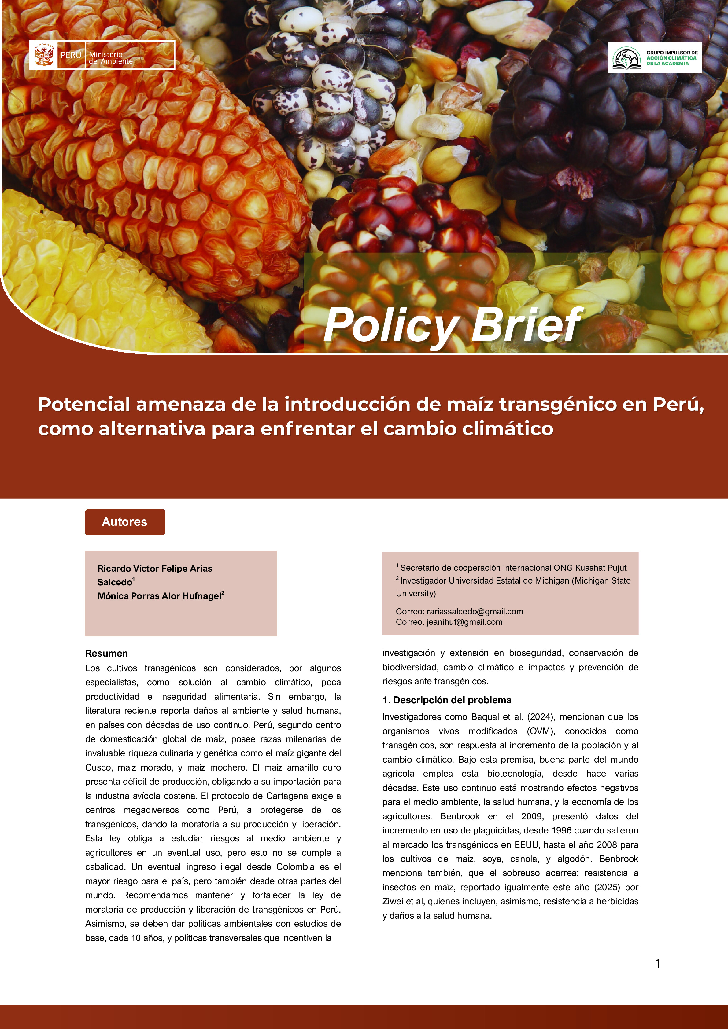 DescripciónAborda la potencial amenaza de la introducción de maíz transgénico en Perú, país considerado el segundo centro de domesticación global de maíz con 52 razas nativas, poseedor de una invaluable riqueza culinaria y genética. Aunque algunos especialistas ven a los cultivos transgénicos como una solución a la baja productividad y al cambio climático, la evidencia reporta daños a la biodiversidad, al medio ambiente y a la salud humana. Perú cuenta con la Ley de Moratoria a Organismos Vivos Modificados (OVM) vigente hasta 2035 para protegerse , pero existe un alto riesgo de ingreso ilegal de maíz transgénico "genérico" (sin patente) desde Colombia. Las investigaciones realizadas en Perú demuestran que el polen de maíz puede dispersarse grandes distancias con el viento (hasta 5 km en la costa y 1 km en valles interandinos) , lo que intensifica el riesgo de contaminación y desplazamiento de las razas nativas por el polen híbrido, especialmente porque el maíz amarillo duro importado se cultiva a mayor altitud debido al cambio climático. El informe recomienda mantener y fortalecer la Ley de Moratoria e implementar políticas ambientales y estudios de línea base cada 10 años, además de promover programas de transferencia de conocimientos a agricultores sobre los riesgos de los transgénicos.